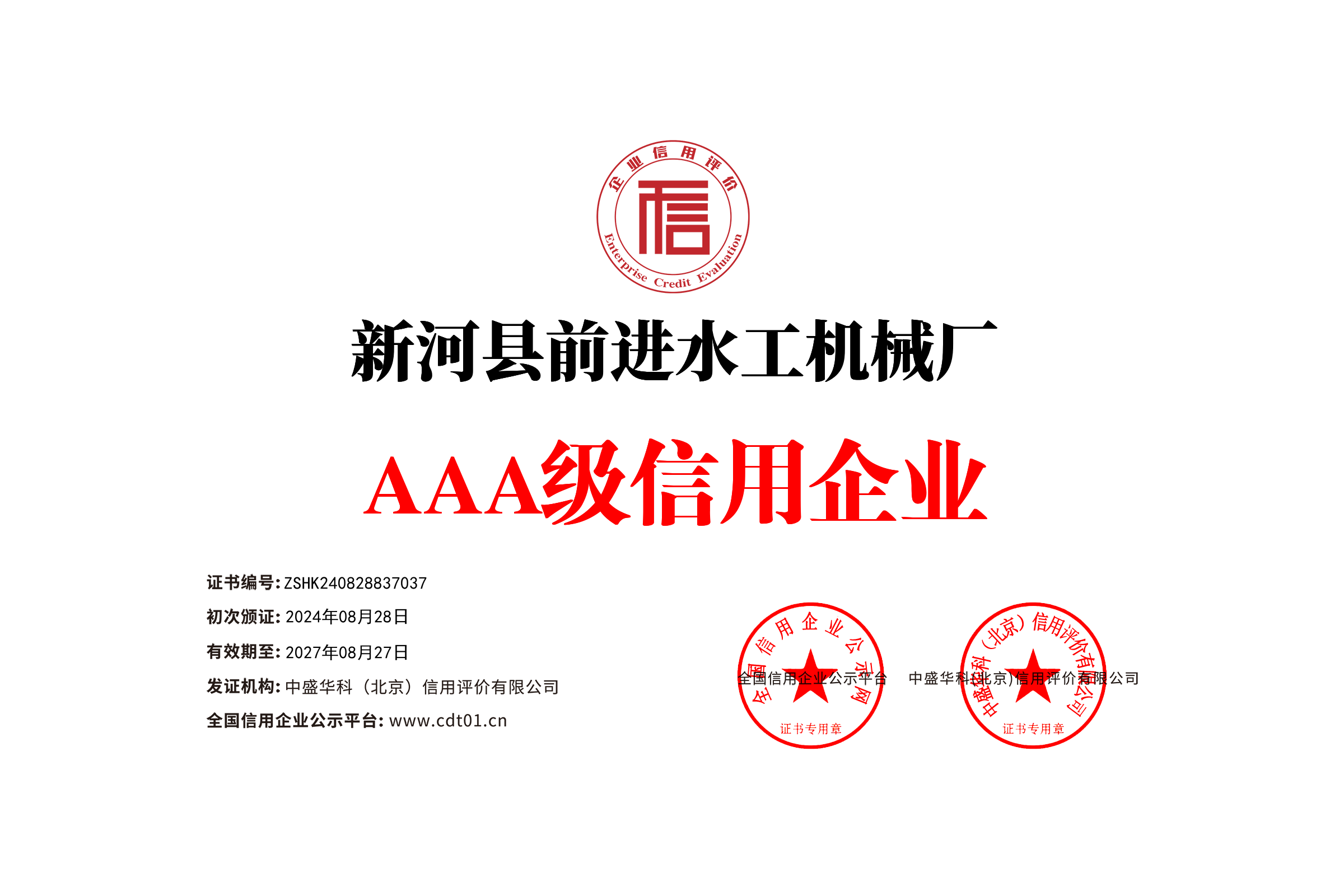 诚信企业信用等级证书